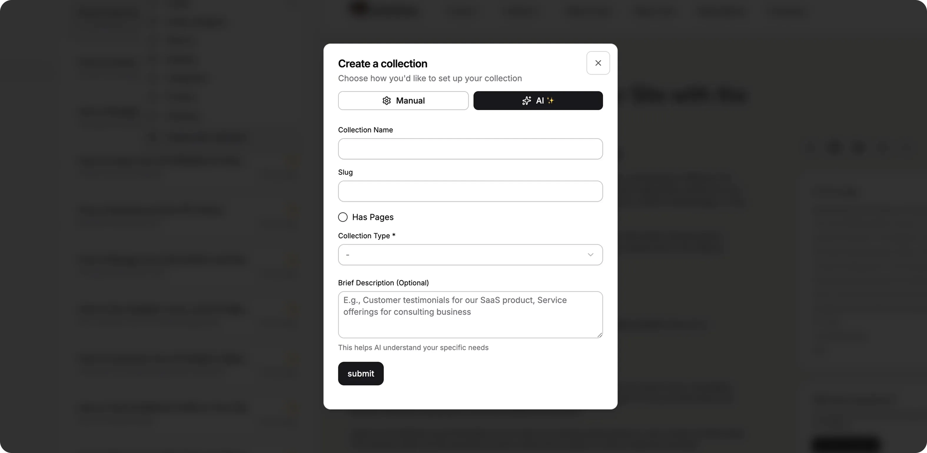 Collections are Pixelesq's CMS. Define a schema once and create as many entries as you need. Supports 9 field types and AI-generated schemas.