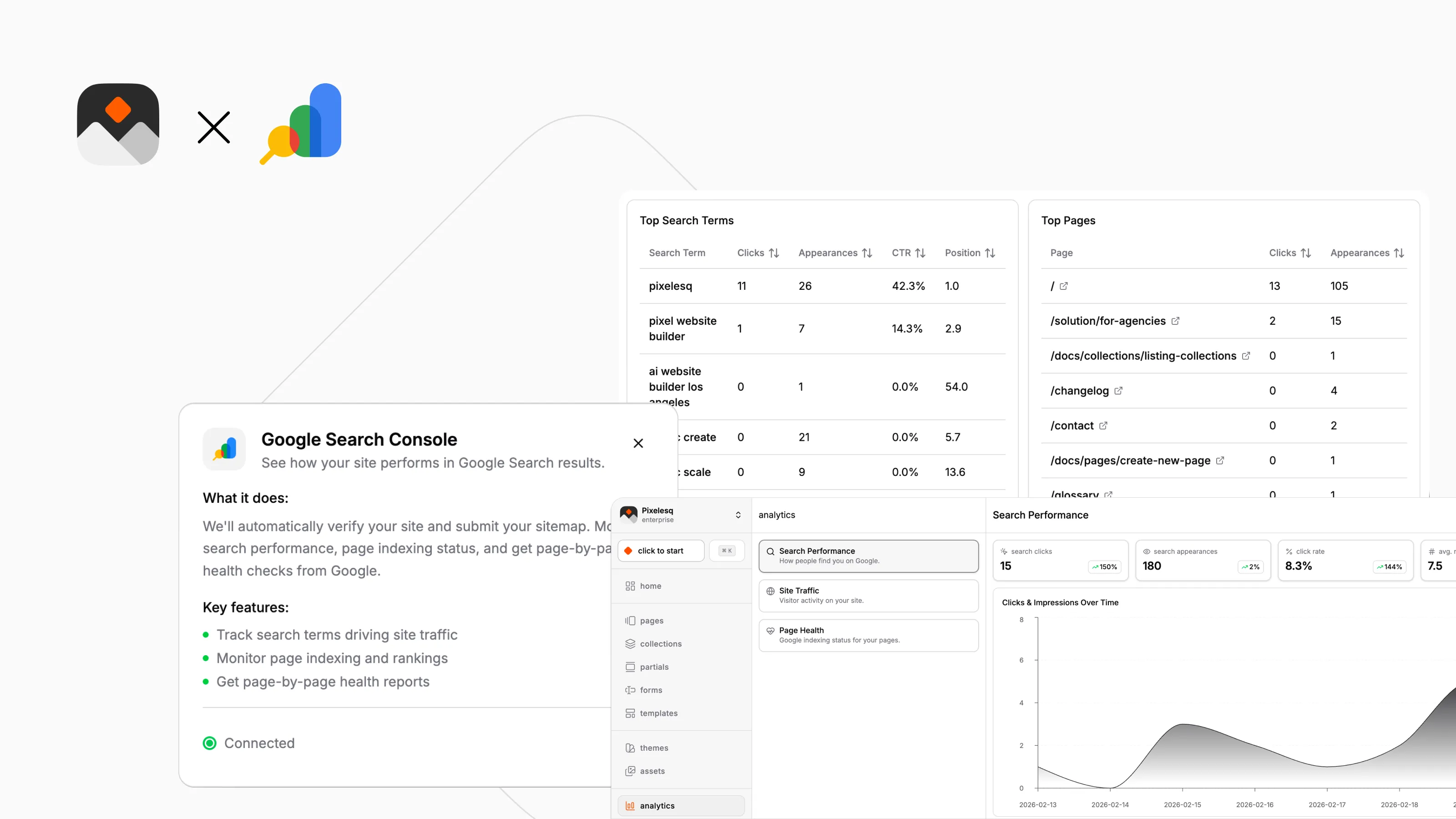 See exactly how your site performs in Google Search. Which terms people use to find you, which pages rank highest, and whether Google can properly index your content. Pixelesq pulls data directly from Google Search Console and presents it in marketer-friendly language with AI-powered insights.